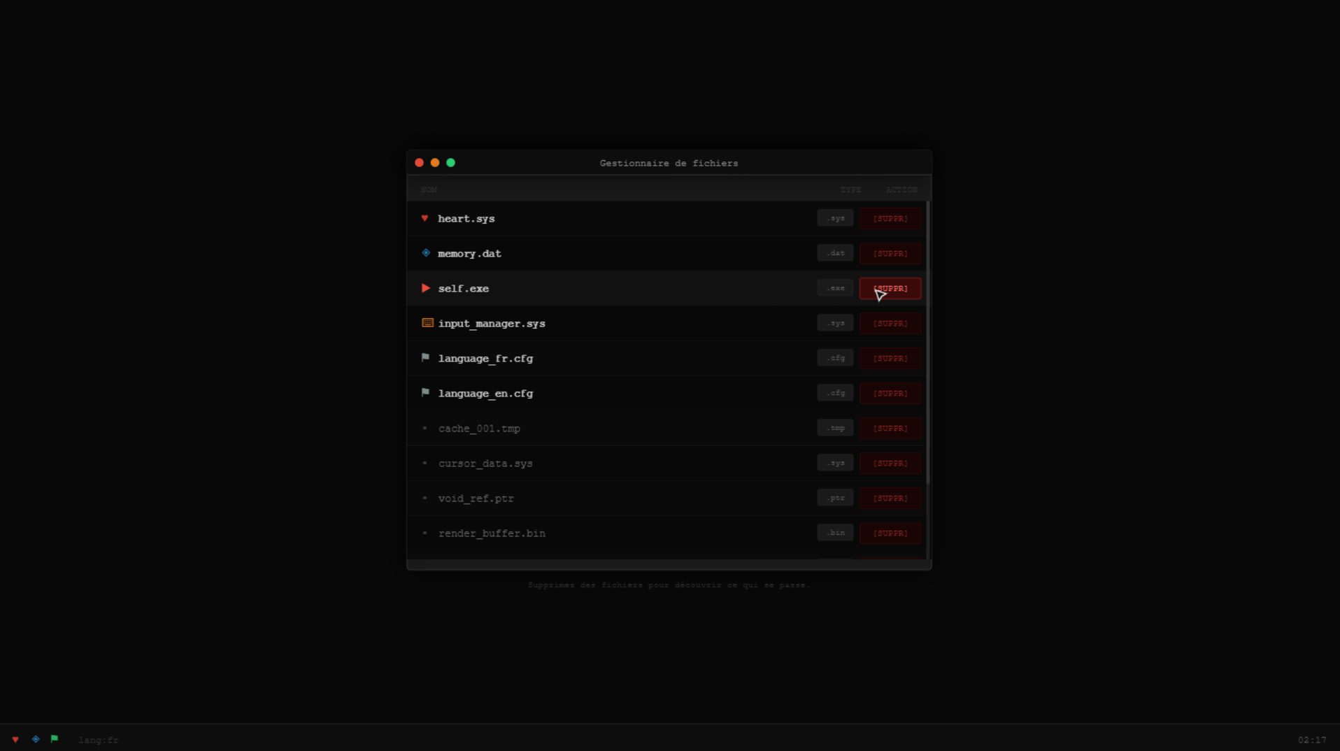 DELETE YOURSELF est un jeu narratif minimaliste d’exploration, se déroulant à l’intérieur d’une fausse interface de système d’exploitation.